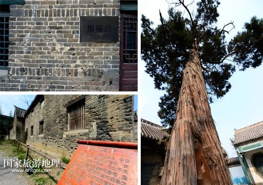 位于臺(tái)兒莊古城的臺(tái)兒莊大戰(zhàn)指揮所(左上)、民居(左下)和清真寺內(nèi)柏樹(右)上,仍保存著當(dāng)年臺(tái)兒莊大戰(zhàn)中留下來的彈孔(拼版照片,4月8日攝)。
